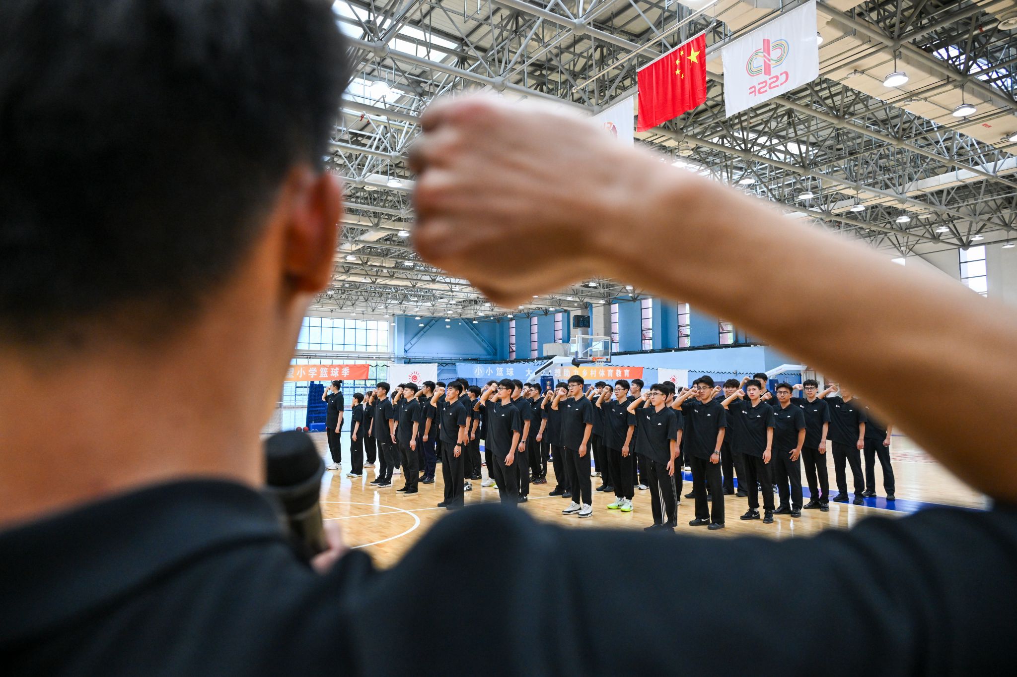 在出征仪式开始前,志愿者代表以自编篮球操生动呈现了篮球基础技能,他们动作整齐、充满活力的表演赢得大家阵阵掌声。随后,刘铁教练带领下太阳集团网站男子篮球队也进行了展示,队员们技术扎实、配合默契,充分展现出优秀的篮球水平和昂扬向上的精神风貌。